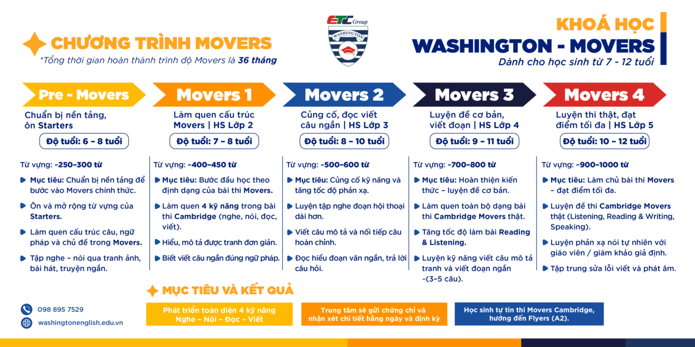 Khóa học Tiếng Anh Washington Movers dành cho học sinh từ 7 – 12 tuổi. Chương trình gồm 5 cấp độ: Pre- Movers ( dành cho các em học sinh chưa theo học các chương trình Starters của Washington), Movers 1 ( HS lớp 2). Movers 2 ( HS lớp 3), Movers 3 ( HS lớp 4), Movers 4 ( HS lớp 5)