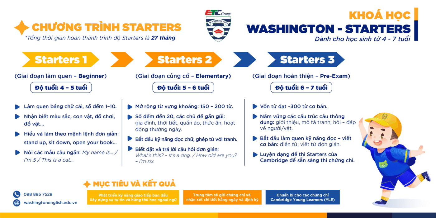 Khóa học Tiếng Anh Washington Starters ( 4-7 tuổi) dành cho học sinh từ 4 đến 7 tuổi, gồm 3 cấp độ ( Starter 1, starter 2, starter 3). Mỗi cấp độ học 9 tháng/ 1 giáo trình.